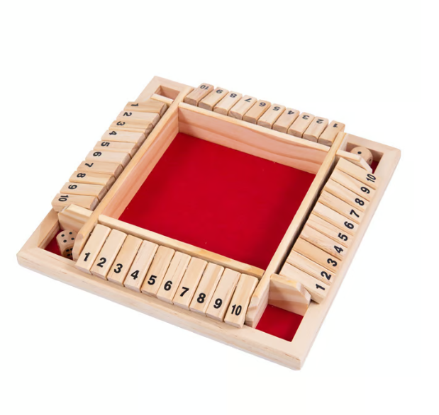 - Shut the Box peut se jouer seul ou à plusieurs. Chaque manche commence par l'abaissement des leviers afin que tous les numéros soient visibles. Ce processus est également appelé « ouvrir toutes les boîtes ». Le joueur qui obtient le meilleur résultat aux deux dés commence.