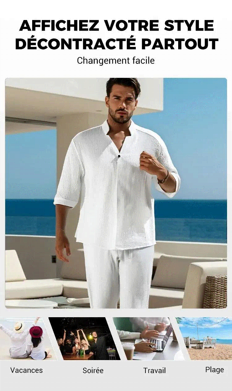 Cet ensemble deux pièces en coton pour homme, composé d'un haut léger et d'un pantalon décontracté, est idéal pour un look élégant et une sensation de fraîcheur naturelle. Parfait pour l'été ou pour se détendre.